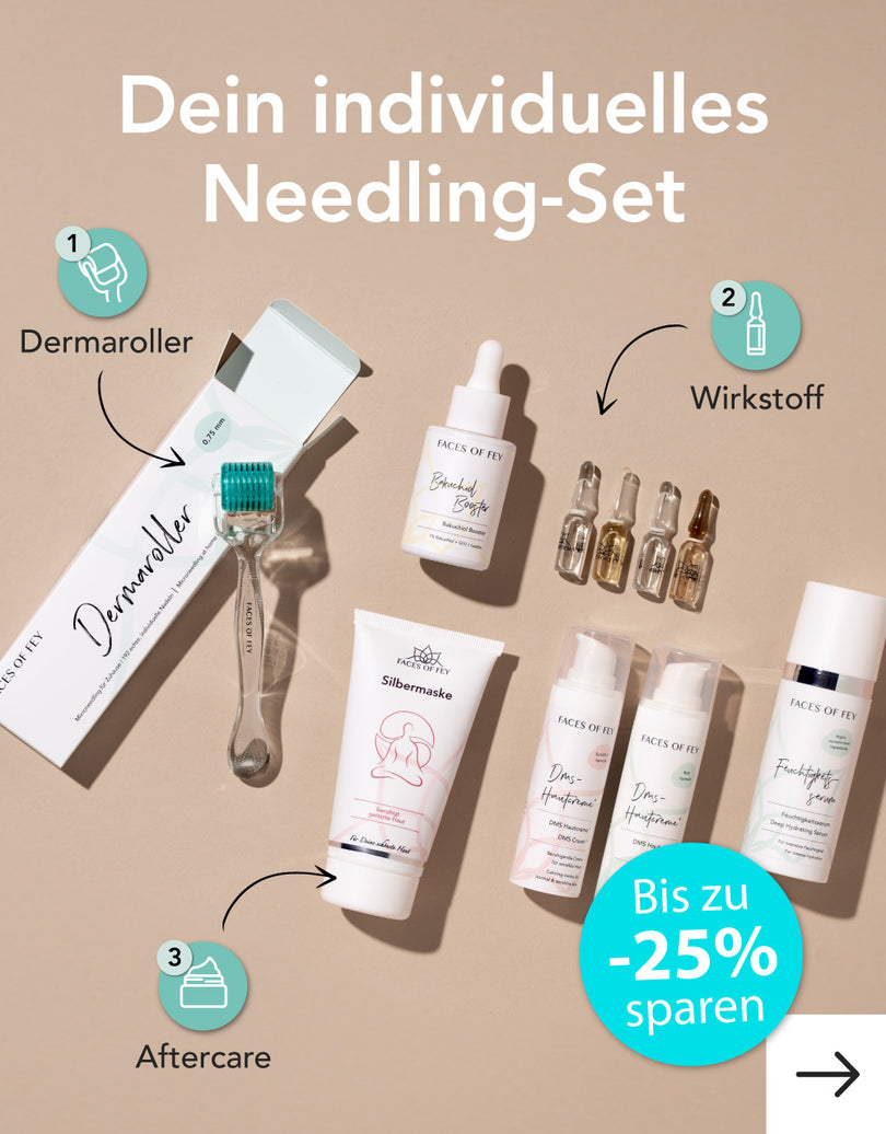 Nach dem Microneedling ist Deine Haut gereizt und neigt zu Trockenheit. Um Deine Haut optimal mit Feuchtigkeit zu versorgen, empfehlen wir Dir unser Feuchtigkeitsserum. Neigst Du nach dem Needling hingegen zu geröteter Haut, hilft Dir unsere Silbermaske. Wenn Du Deine Haut nach dem Microneedling pflegen möchtest, empfehlen wir Dir unsere DMS Cremes: